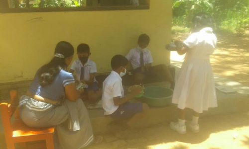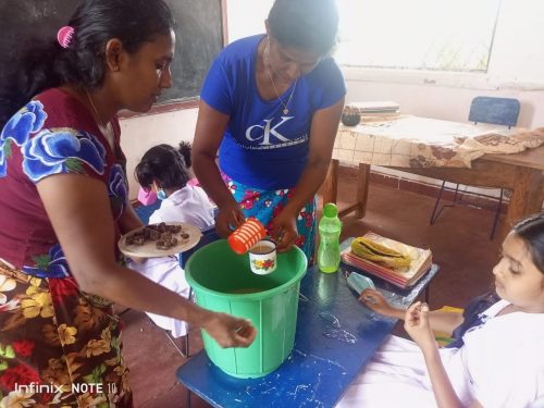 The children and teachers are all in, preparing the school for our project. Every day is a different meal. We started by giving them coconut sambol and rice, but now their bellies are filled with rice, eggs, potatoes, millet roti, milk rice, and fruit. We have a variety of menus.