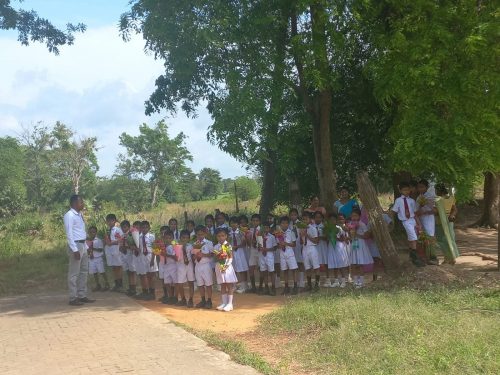 Recently, during a visit to the school, we were greeted with a beautiful, poignant welcome. The children presented us with a basket of flowers, plucked fresh from the wewa (tank) nearby, and invited us to offer them to the Buddha.